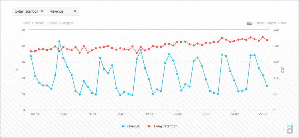 In our example (on the picture above), correlation equals to 9%, which means that there is no correlation. Does it mean that if we want to increase the revenue, we can do anything we want, but increasing the 1-day retention wouldn't help us? No, it doesn’t.