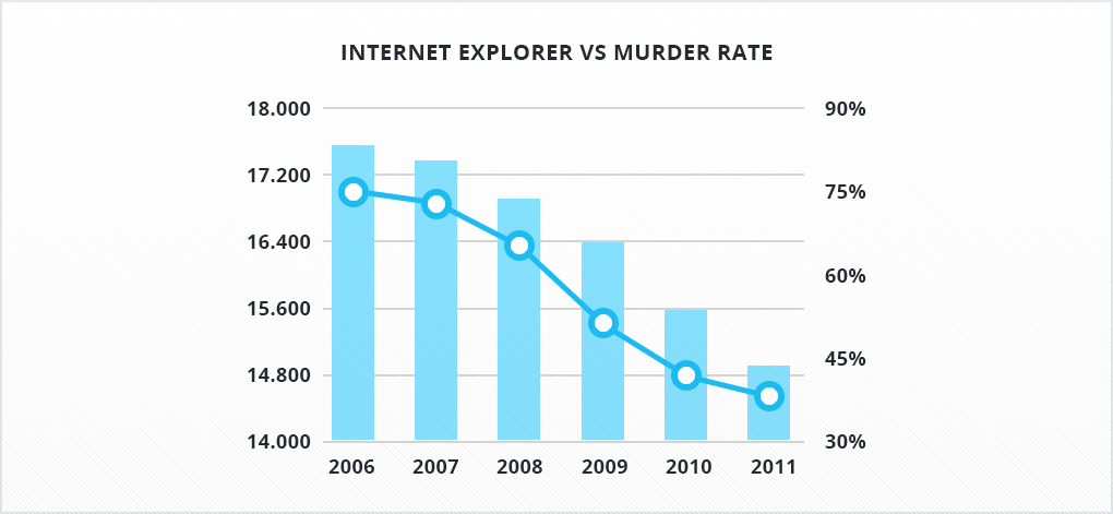 Or here's another example: the Internet Explorer browser market share in the US versus the number of murders in the United States.