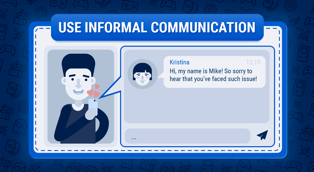 We recommend avoiding an overly formal communication style. If you're too formal, players might get the impression they're talking to a robot rather than a person. In our experience, this impression greatly complicates the communication process and can frustrate players. This is extremely important when interacting with players who have invested in your project because they expect an especially high level of service quality. You can read more about an informal communication style in this article.