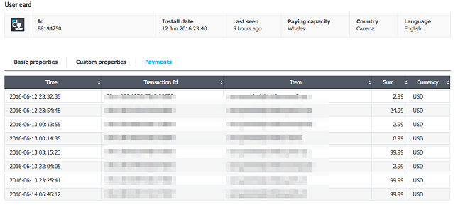 Secondly, the profiles store information about the user's payments: when he paid, how much and for what. It's like "trying on" his profile and helps to better understand the motive of his actions: why he bought this IAP, why the certain time passed between the payments and so on.