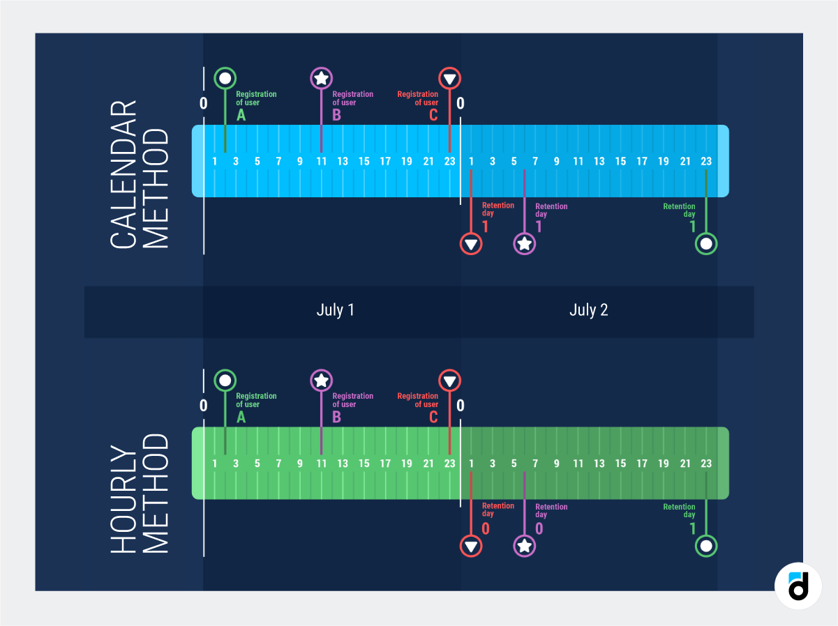 The hourly retention rate calculation is much less vague. In this case, the D1 retention rate includes all users who opened the app within the period from 24 to 48 hours from the moment of its installation. Therefore, the hourly D1 retention rate is always less than the one calculated by calendar days.