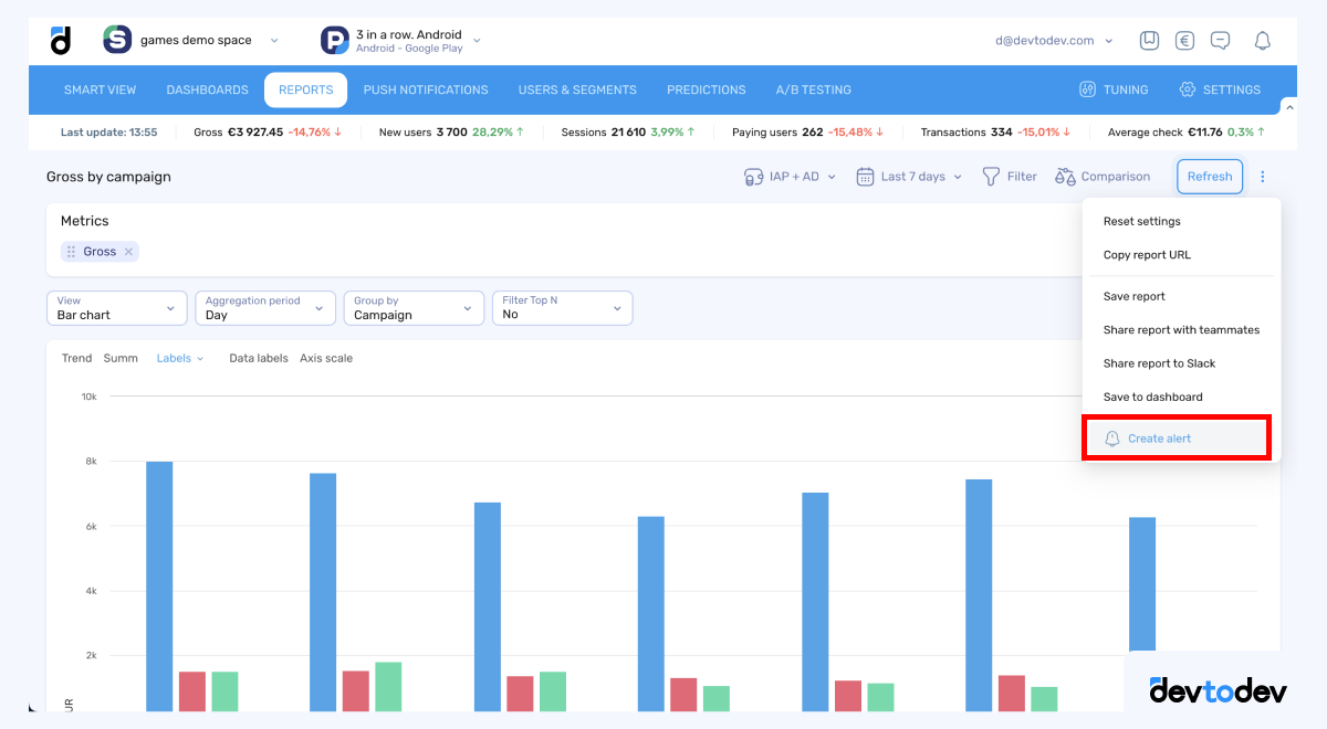 With this update, you can now quickly create alerts for selected metrics directly from the BM report. Simply click the "Create alert" button, and you’ll be redirected to the Alerts section, where the alert creation wizard will open with the chosen metric preselected.