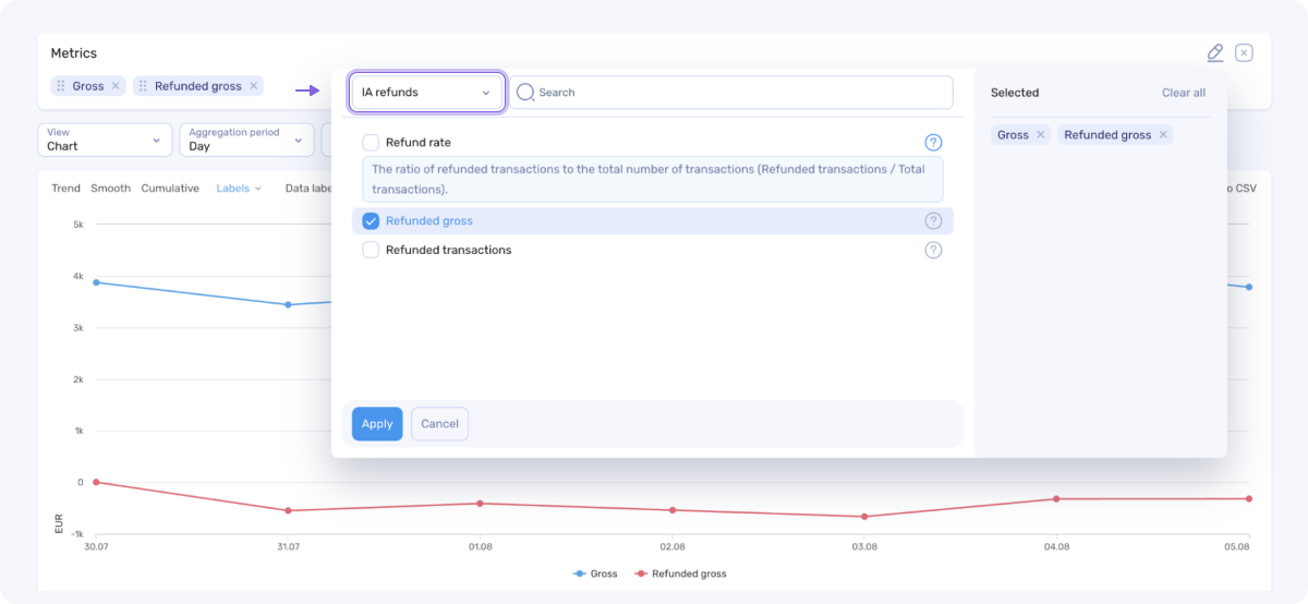 - Basic Metrics report: Refunded transactions, Refunded gross, Refund rate (refunded transactions ÷ total transactions)