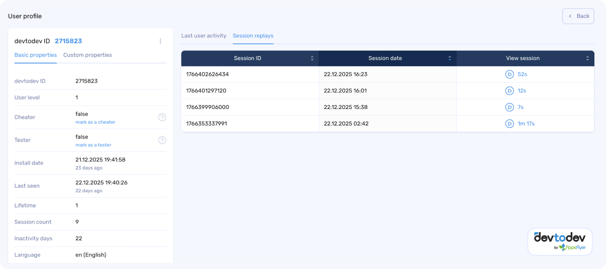 Session Replays are fully integrated into devtodev’s analytics workflow.